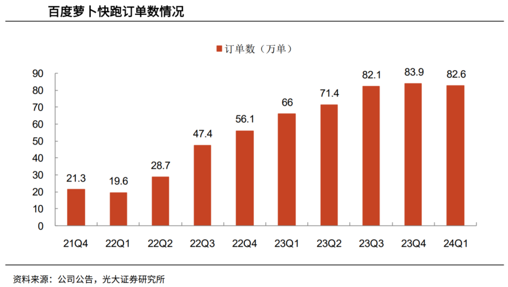 根据百度公司公告,24Q1萝卜快跑完成的自动驾驶订单约82.6万单,同比+25%;截至2024年4月19日,萝卜快跑累计为公众提供自动驾驶出行服务订单超600万单。