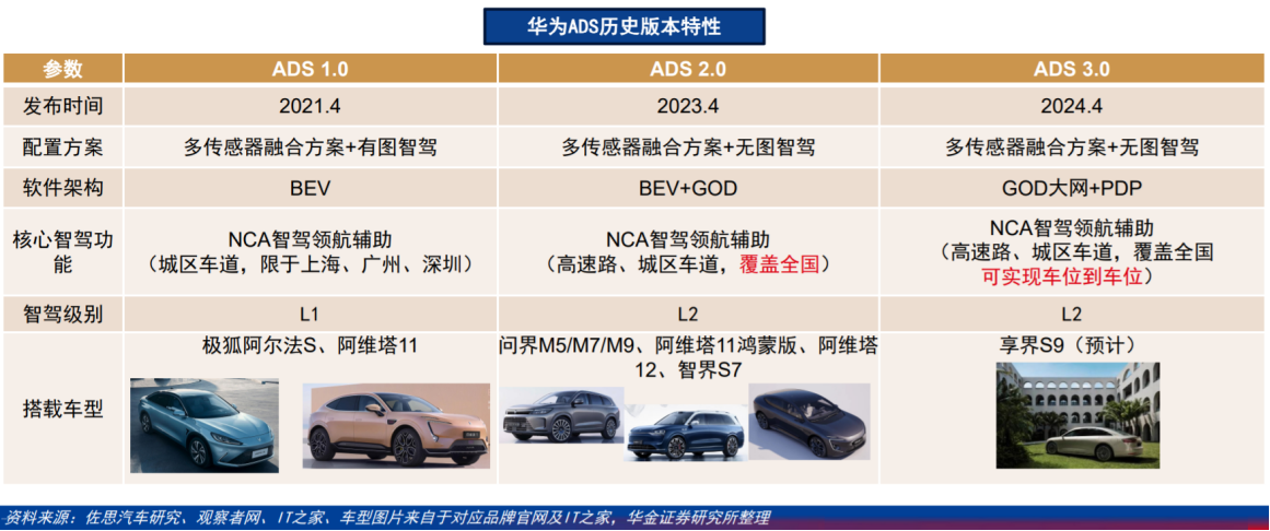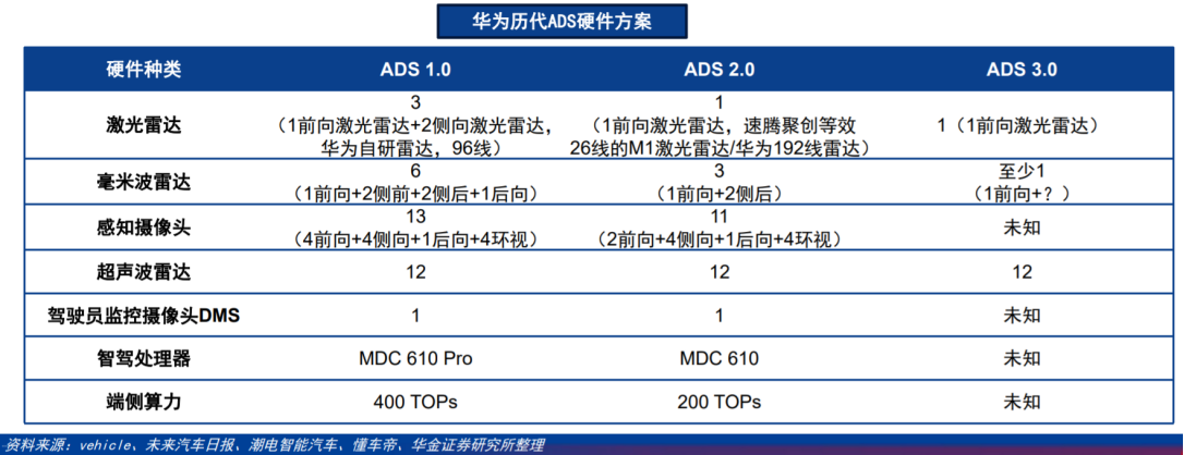 华为ADS智驾方案始终坚持激光雷达+毫米波雷达+摄像头的多传感器融合路线,行业降本压力下硬件配置从超配逐步转向贴合实际需求,带动整体硬件成本下降。