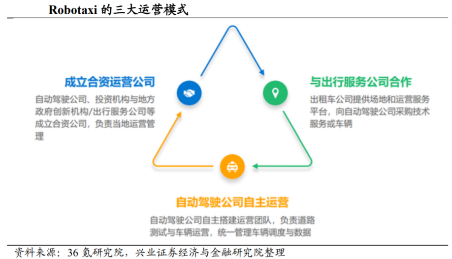 Robotaxi作为“共享化出行+自动驾驶”的结合产物,主要有三种运营模式,包括:成立合资运营公司(如百度与长沙先导产业投资)、与出行服务公司合作(如AutoX与深圳鹏城、高德打车)和自动驾驶公司自主运营(如小马智行)等。