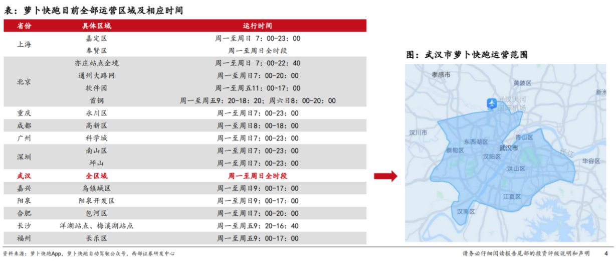 运营车辆与车型:武汉百度萝卜快跑车型主要是极狐阿尔法T,续航653公里,最长运营车辆已行驶12万公里。此外,百度与江淮深度合作定制的MPV车型RT6,车型造价较低,续航380公里,空间相对较大,目前仅作为用于测试车型,暂未投入乘客服务。
