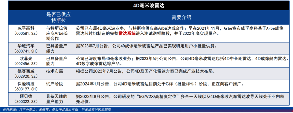 特斯拉在HW4.0硬件配置当中,新配高精度4D毫米波雷达;据特斯拉备案文件显示,系来自Arbe的Phoenix雷达。目前,国内目前已具备4D毫米波雷达生产能力的A股上市公司主要包括: