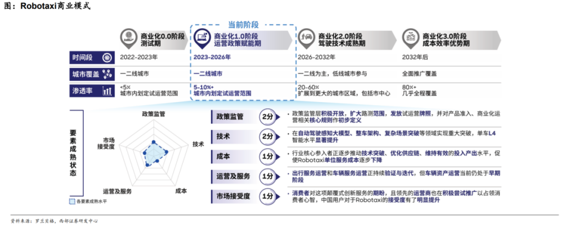 Robotaxi商业化1.0阶段:技术推进政策配套,并通过商业化运营反哺技术进步,完成开城规划。当前阶段,以政策为导向,核心关注技术层面突破,为后续阶段实现大规模量产先决条件。
