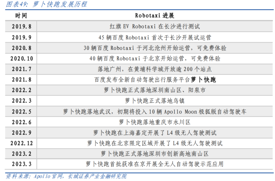 百度集团已于2019年开始C端探索,开启并已落地Robotaxi业务:百度Robotaxi业务布局较早,属于国内第一梯队,目前已经在国内北上广深等10个城市开展商业化运营,百度ApolloL4级自动驾驶运营测试里程累计已超5000万公里。其中,2023年3月17日,百度“萝卜快跑”首批获准在京开展全无人自动驾驶示范应用,这是全球范围内全无人车队首次在首都城市落地,至此,萝卜快跑已在北京、武汉、重庆三个城市开启全无人自动驾驶出行服务。Robotaxi的商业化落地可以帮助百度持续收集数据,从而反哺、优化其算法,提升其算法能力,形成正向循环。