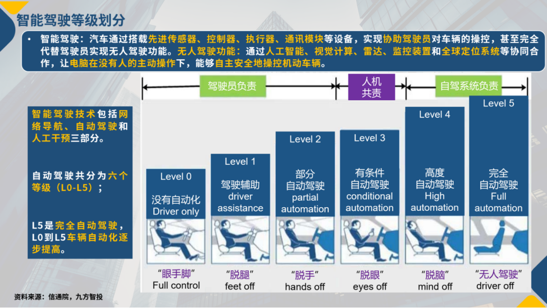 智能驾驶有L0到L5六档分类,其中L3到L4为智能驾驶分水岭:根据SAE以及《国家车联网产业标准体系建设指南(智能网联汽车)(2017年)》,智能驾驶由下至上分为六级,自动化程度逐步提升。