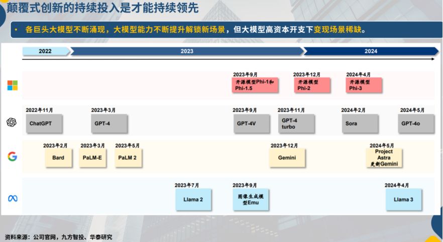 颠覆式创新的持续投入是才能持续领先。各巨头大模型不断涌现,大模型能力不断提升解锁新场景,但大模型高资本开支下变现场景稀缺。