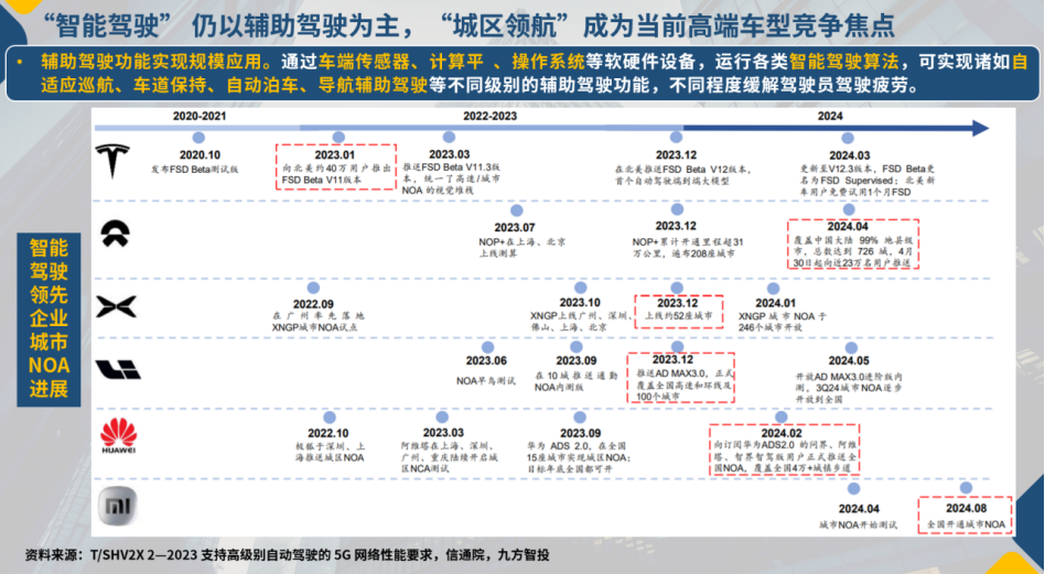 其中,萝卜快跑在开城数量+投放数量+实际运营进展保持行业领先,目前全国已覆盖12座城市,武汉市年内预计完成千台运营车部署;计划到2024年底在武汉部署1000辆无人驾驶出租车,并力争在2025年实现盈利。华为、小鹏、理想、小米无图城市NOA2024年将加速开通,特斯拉FSDV12端到端版本将进一步开放测试及使用;