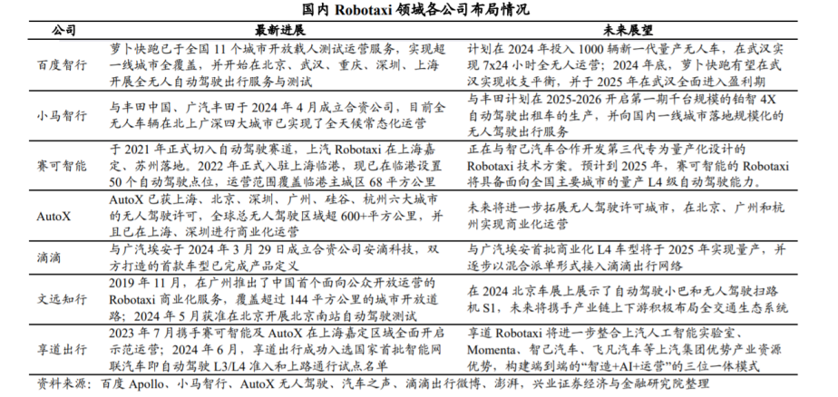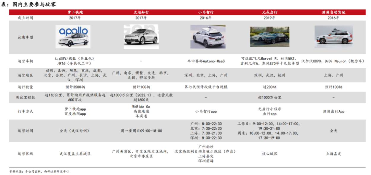 伴随技术安全得到市场充分验证后,倒逼政策进一步放开,降本和消费者教育将成为行业大规模量产关键要素,后续采取第三方运营公司形成布局,未来具备成本效率优势的企业有望引领行业格局,国内关注萝卜快跑、小马智行等。