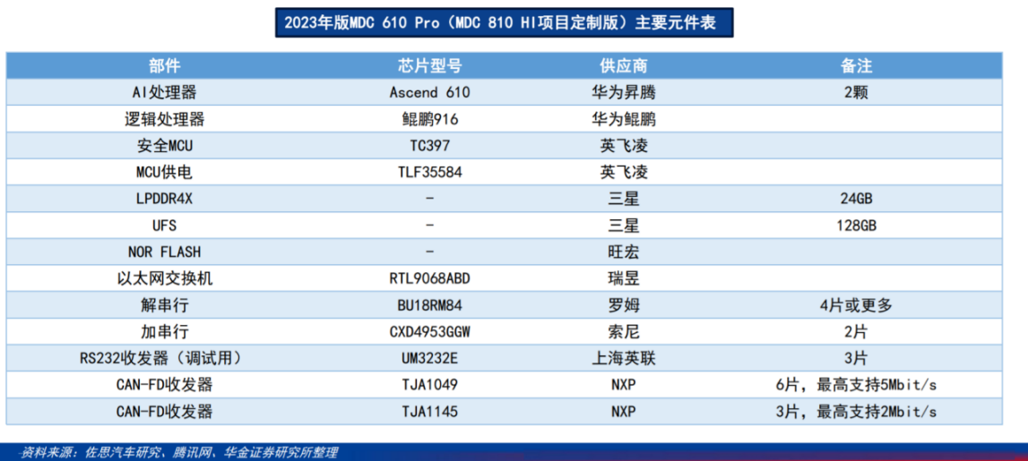 2.华为ADS端侧计算SoC主要由AI处理器、MCU、图像处理器、存储处理器等组成,其中,主控芯片采用鲲鹏CPU+昇腾系列AI处理器组合,存储器及MCU方面,以MDC610pro为例,分别来自三星、英飞凌。