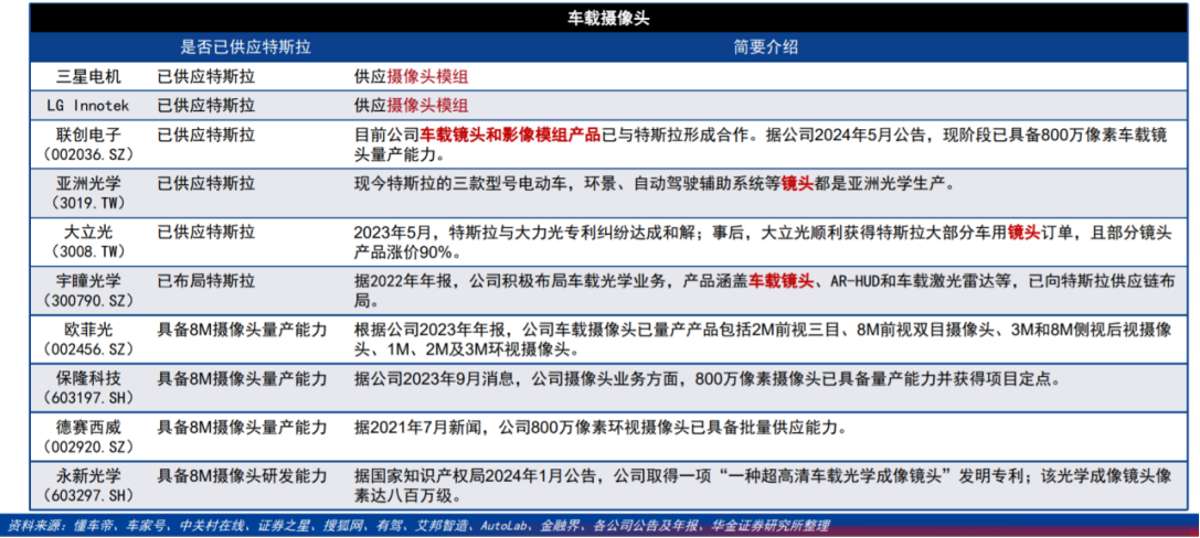 特斯拉车载镜头供应商包括联创电子、亚洲光学、大立光等;车载摄像头模组主要为LG、三星电机等。最新的特斯拉HW4.0摄像头主要由三星电机(供应比例80%)、LGInnotek(供应比例20%)代工制造,HW4.0摄像头已升级为500万像素级,国内目前已具备500万像素级或以上车载摄像头生产能力的A股上市公司: