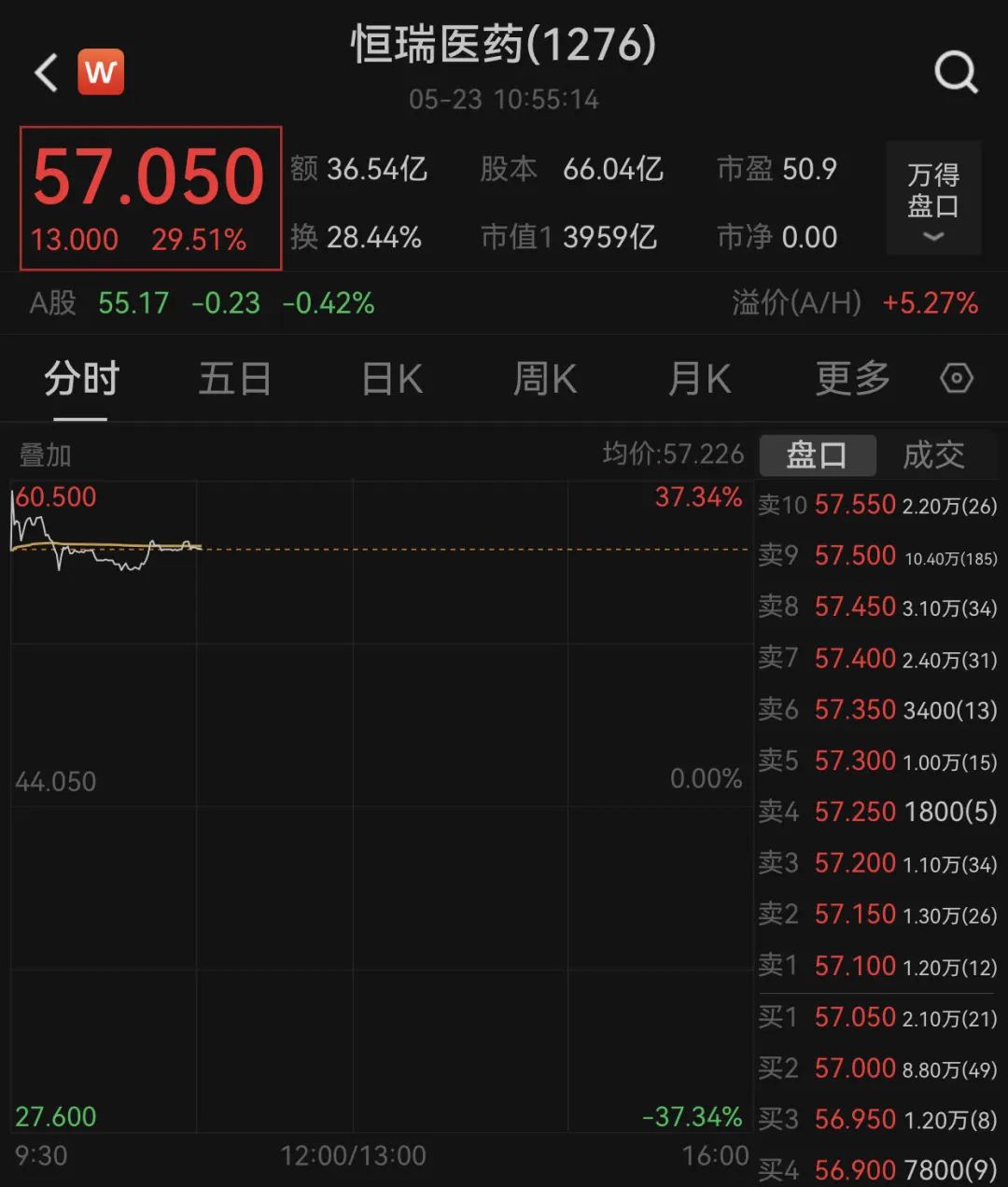 5月23日,继宁德时代之后,A股医药巨头恒瑞医药(600276.SH/01276.HK)正式登陆港交所。上市前夕(5月22日),其暗盘交易已大涨超30%,引发市场高度关注。今日早盘,恒瑞医药高开29.4%,报57港元/股,其发行价为44.05港元/股。开盘后,恒瑞医药涨幅一度超过37%,随后有所回落,截至记者发稿,恒瑞医药涨幅接近30%。