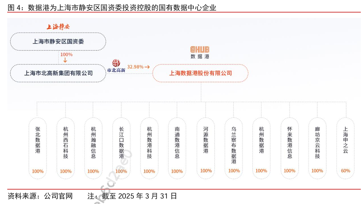 公司介绍:国资数据中心龙头,深度绑定头部客户。数据港成立于2009年,是上海市静安区国资委投资控股的国有数据中心企业。经过七年的高速发展,数据港于2017年2月8日成功登陆A股主板市场,当前市北高新控股32.98%。公司深度绑定头部互联网、运营商客户,核心业务聚焦IDC服务器托管服务。数据港作为中国领先的第三方数据中心运营商,北至乌兰察布、张北,南至广东深圳、河源,在“东数西算”的京津冀、长三角、粤港澳大湾区的枢纽节点上共建设运营35个数据中心,截至2024年12月31日运营总电力容量371MW,折算成容量5kw/个标准机。