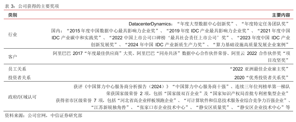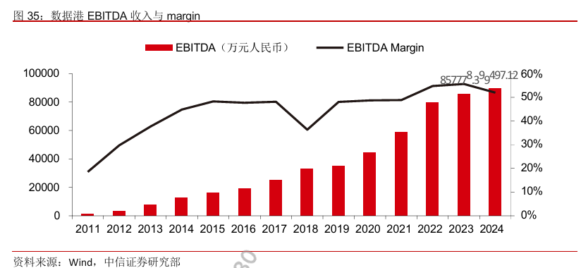2)终端客户直销模式。公司核心业务深度绑定头部互联网、运营商客户。数据港作为中国领先的第三方数据中心运营商,北至乌兰察布、张北,南至广东深圳、河源,在“东数西算”的京津冀、长三角、粤港澳大湾区的枢纽节点上共建设运营35个数据中心,截至2024年12月31日运营总电力容量371MW。公司2024全年实现营业收入约17.2亿元,同比增长11.6%;实现归属于上市公司股东的净利润约1.3亿元,同比增长7.5%。我们预计,在与核心客户深度绑定下,AI带动的数据中心需求将持续催化公司业绩稳健向上。