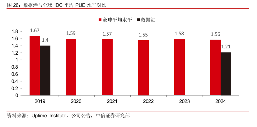 数据港在全国建成35座数据中心,折算标准机柜超7.42万个,IT负载规模达371.1兆瓦,可支撑每秒200亿亿次运算量级算力。公司数据中心核心技术指标PUE达到平均1.21、最低1.09的国际领先水平。数据中心规划、合理性布局、成本控制及运维等方面,将持续将节能环保的理念融入从选址、设计、建造到运营的全流程中,加大采用各类创新节能技术,推动达成PUE、WUE等能耗目标。