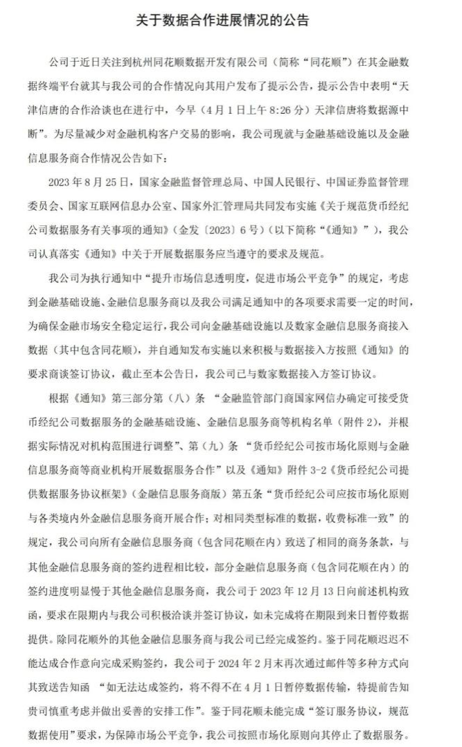 此外,4月9日天津信唐货币经纪有限责任公司官微称,由于同花顺迟迟不能达成合作意向完成采购签约,公司按照市场化原则向其停止了数据服务。