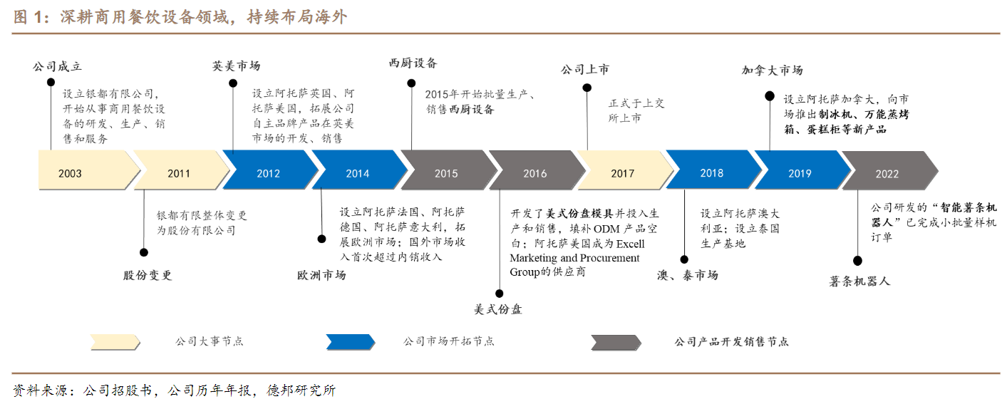 看点一:餐饮设备龙头公司是一家专业从事商用厨房设备研发、生产、销售和服务的综合性企业,旗下拥有多个自主品牌,2012年起开始重点发展国际市场,注册成立了阿托萨厨房设备美国公司及阿托萨厨房设备英国公司,并于2014年设立德国、法国、意大利子公司2018年开始在泰国设立工厂,2022年开始逐步向智能餐饮设备布局。