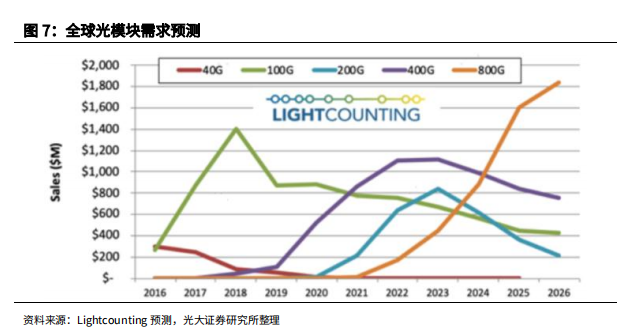 其中,800G光模块具有高速传输、高密度、低功耗和高可靠性的特点,可广泛适用于IDC数据中心、光通信骨干网等应用场景。AIGC的高速发展也将进一步加速光模块向800G及以上产品迭代。根据机构测算,预计800G光模块的市场规模有望从2022年的2亿美元上升至2025年的16亿美元。