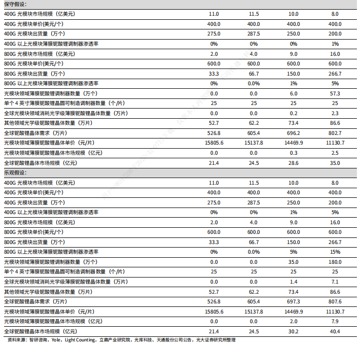 市场规模方面,预计2025年全球铌酸锂晶体市场规模有望达到35-40.4亿元,2022-2025年CAGR17.9%-23.6%,其中光模块领域薄膜铌酸锂市场规模的占比将有望达到7.2%-19.6%,约2.5-7.9亿元。