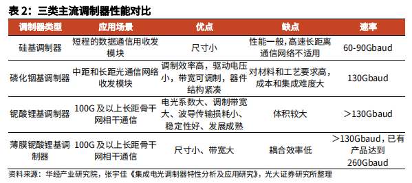 按材料划分,常见的电光调制器可以分为硅基调制器、磷化铟调制器和铌酸锂调制器。其中,薄膜铌酸锂调制器具有尺寸小、带宽大的优点,也有较强的电光效应,是实现电光调制功能的重要材料之一,适配于800G等高速率光模块场景。薄膜铌酸锂技术路线未来可期。
