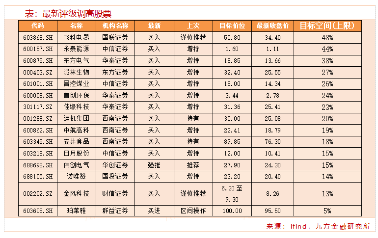 近5日有54家公司获得券商调高评级,飞科电器、永泰能源、东方电气、派林生物、晋控煤业、首创环保、佳缘科技、运机集团等获证券给出明确目标价格。