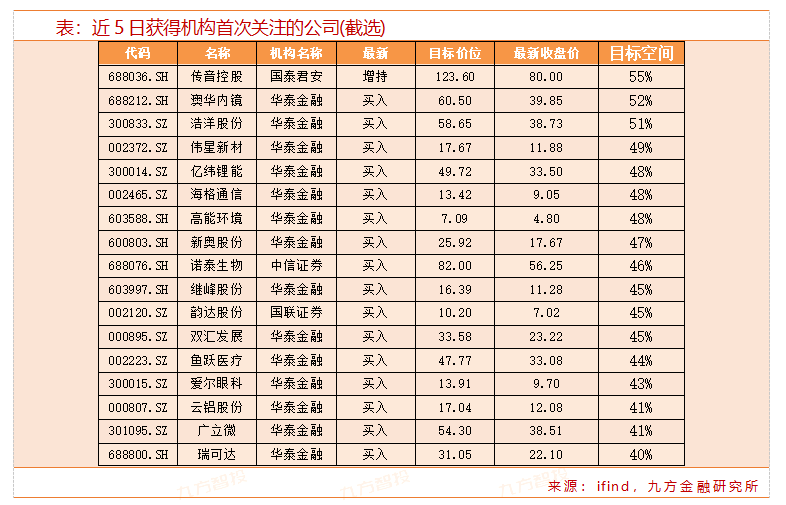 最新机构首次关注股票方面,近5日共有113份研报对上市公司进行首次覆盖,其中,56家获得明确的目标价格。