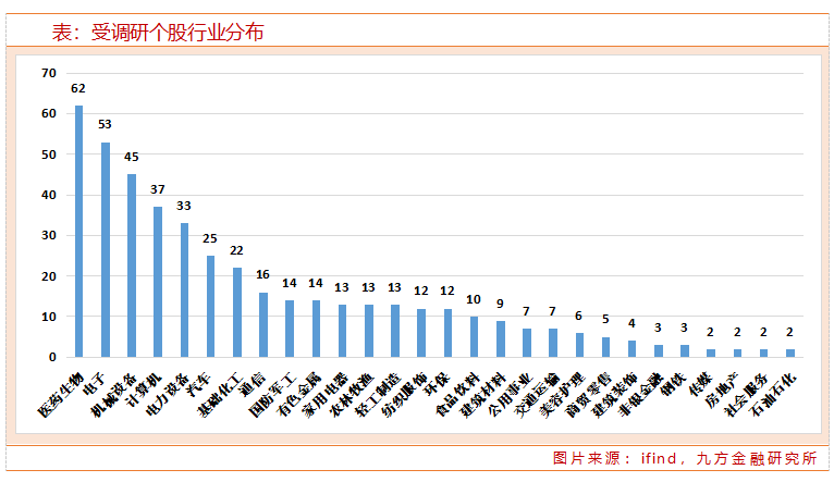 从行业分布来看,本期医药生物行业调研量居首,有62家上市公司接受调研;随后为电子行业,有53家上市公司接受调研。