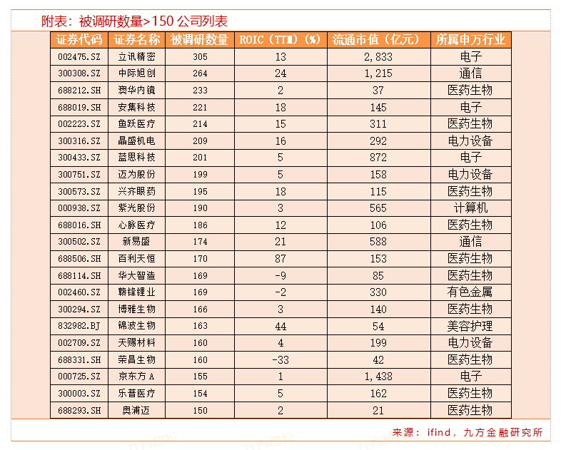 聚焦本周机构调研的公司,立讯精密调研总数居首,有305家机构参与;随后为中际旭创、澳华内镜、安集科技、鱼跃医疗、晶盛机电、蓝思科技,均有超过200家机构参与调研。