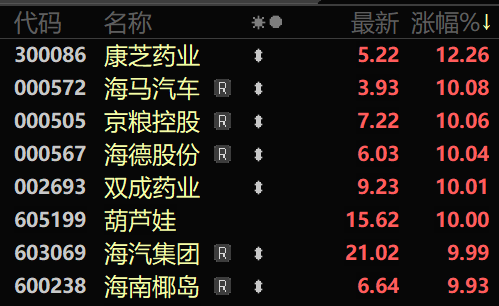 海南自贸概念今日全线上涨,板块指数跳空高开高走,放量大涨逾4%。海马汽车、海南椰岛、海德股份、海南发展等涨停。