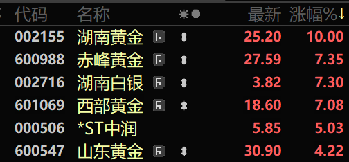 市场热点方面,黄金概念股今日继续强势上攻,板块指数大涨近5%,创历史新高。华钰矿业、湖南黄金涨停,赤峰黄金、山金国际等股价创历史新高,潮宏基、湖南白银等亦大幅拉升。