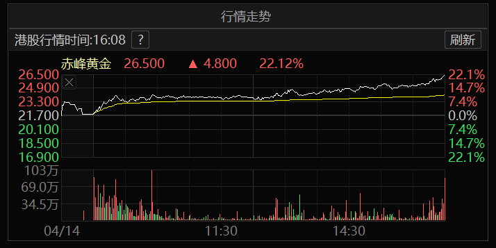 港股黄金股在A股收市后继续拉升,赤峰黄金涨幅扩大至逾22%,以全天最高价26.5港元报收,亦为历史最高,近1个月来累计涨幅超100%;潼关黄金也大涨逾19%,创2007年以来近18年新高,山东黄金、招金矿业、灵宝黄金等也大幅拉升,并创多年新高。