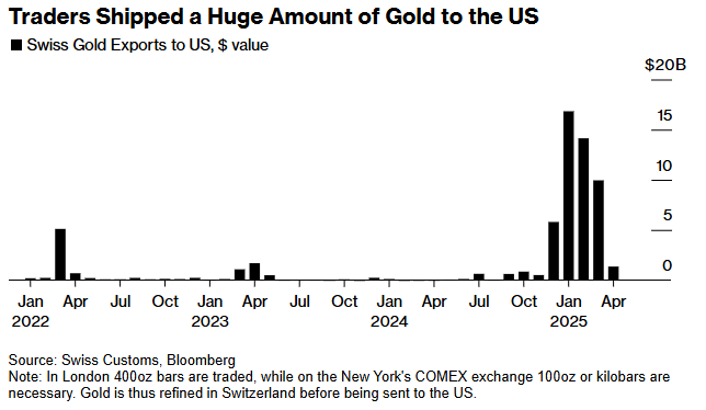 此前曾介绍过,第一季度,纽约商品交易所(Comex)的黄金和白银期货价格,曾一度飙升至了远高于国际基准的伦敦金的水平,这意味着交易员可以在伦敦、瑞士或中国香港等贸易中心购买金条,然后运到美国,在关税生效前获利。