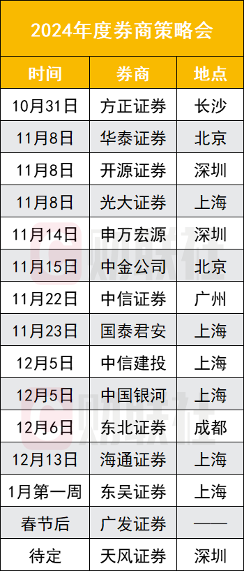 11月15日的中金公司,11月22日的中信证券,11月23日的国泰君安,12月5日的中信建投和银河证券,12月6日的东北证券,12月13日的海通证券,1月第一周的东吴证券,广发证券预计将在春节后举行,天风证券将在深圳举行,但时间待定。