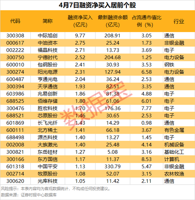 具体到个股,4月7日共有1778股获融资净买入,净买入金额在千万元以上的有347股,其中21股融资净买入额均超1亿元。