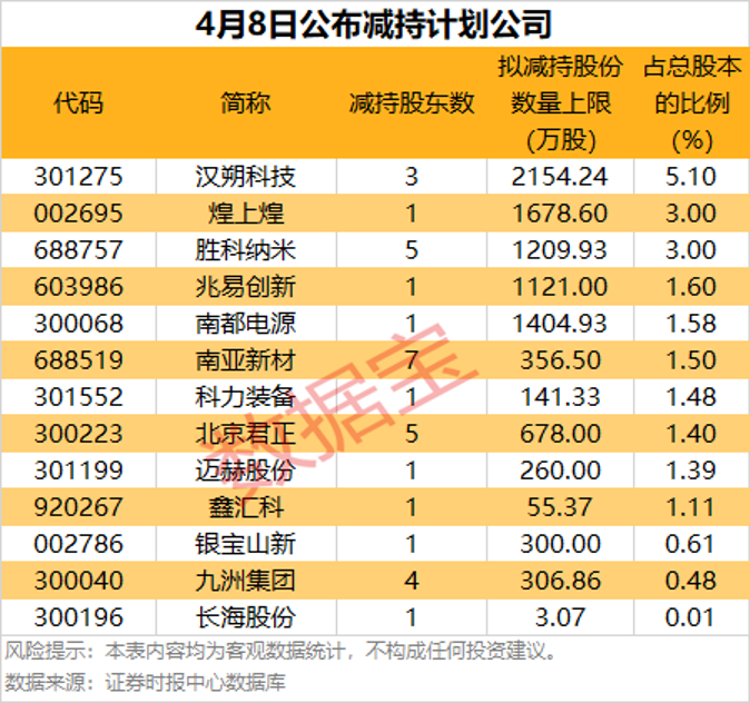 4月8日,13家公司发布了减持计划,拟减持比例居前的有汉朔科技、煌上煌、胜科纳米等。