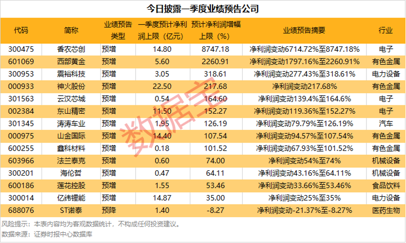 一季报业绩预增股表现强势,今日披露一季度业绩预告的香农芯创开盘大涨18%,西部黄金早盘“一”字涨停,东山精密也强势涨停。
