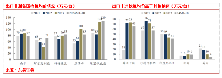 出口非洲各国挖机产品均价高,利润空间大。由于中大挖的技术含量和生产成本较高,且在出口产品中占主导地位,因此,挖机出口的均价提升。