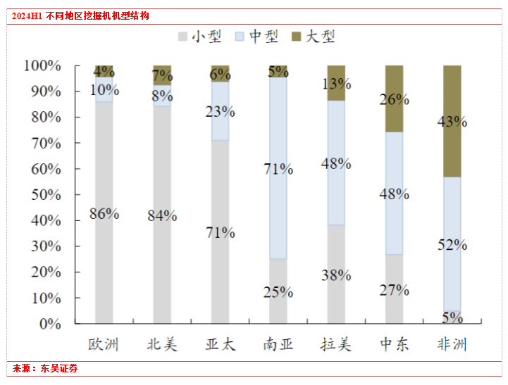 矿山+基建需求下,非洲挖掘机械以价值量高、利润空间大的中大挖为主。南亚、非洲等地由于许多国家还处于基础设施建设的快速发展阶段,以开矿和大基建项目为主,中大挖需求量较大。2023-24H1,矿山和基建驱动下非洲中大挖比重依旧在不断上升,占比从92%上升至95%。