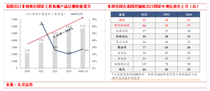 南非、阿尔及利亚等多个非洲国家在我国工程机械贸易伙伴中的地位不断提升。具体来看,2020年中国出口非洲十国工程机械金额仅为22.2亿元,2024M1-10快速提升至57.2亿元,同增28%,2020年至今CAGR高达34%,出口规模持续提升。