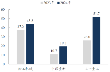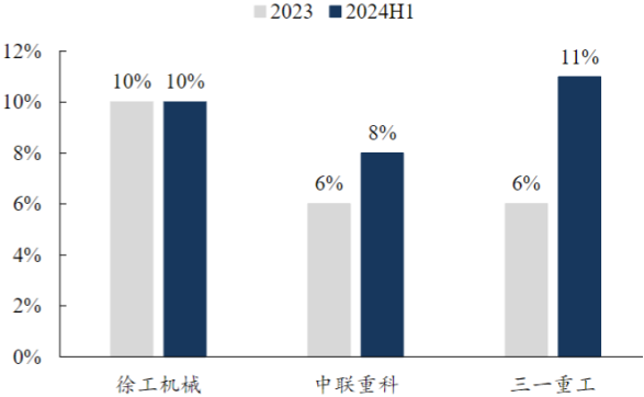 2024H1徐工/中联/三一海外收入结构中,非洲地区的收入占比分别为10%/8%/11%,相比于2023年全年分别提升0/2/5pct。