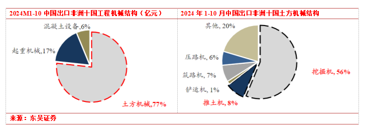 从出口结构来看,由于非洲国家发展时间短,城市化进度较慢,基础设施建设不齐全,工程机械需求多集中在交通基建领域,对土方机械需求较高,对起重机械需求较少。同时挖掘机和推土机也是采矿业最常用的机械之一。