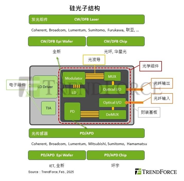 至于硅光子模块当中的CW激光(连续波激光),由于激光的光调变与分波等功能被硅光子(SiPh)制程整合了,因此仅需要提供光源,部分厂商因而进入CW激光的代工供应链当中。如联亚透过帮国际数据中心大厂制作CW 激光、华星光与光环等厂商则结合了激光芯片制程进行代工。