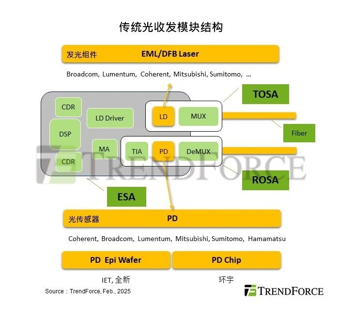 在激光光源的供应链当中,由于EML激光带有调变功能,生产技术困难,再加上目前的高速传输需求,单通道需要达到100Gbps的光传输速度,甚至部分规格达到200Gbps,因此进入门槛相对高。目前主要的供应商多半集中在美日等大厂,如Broadcom、Coherent、Lumentum等公司,鲜少委外代工。