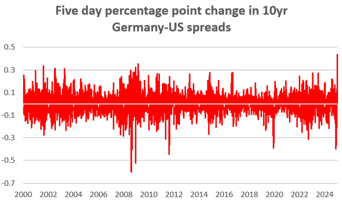 同时,这一次对于欧元来说,强弱的变动可能已并非仅仅局限于外汇投机层面。在债券市场上,一个同样自欧元问世以来就从未出现过的现象是——在过去五个交易日德债跑赢美债的幅度从来如此巨大,10年期美债收益率相较德债收益率的溢价正不断拉大。