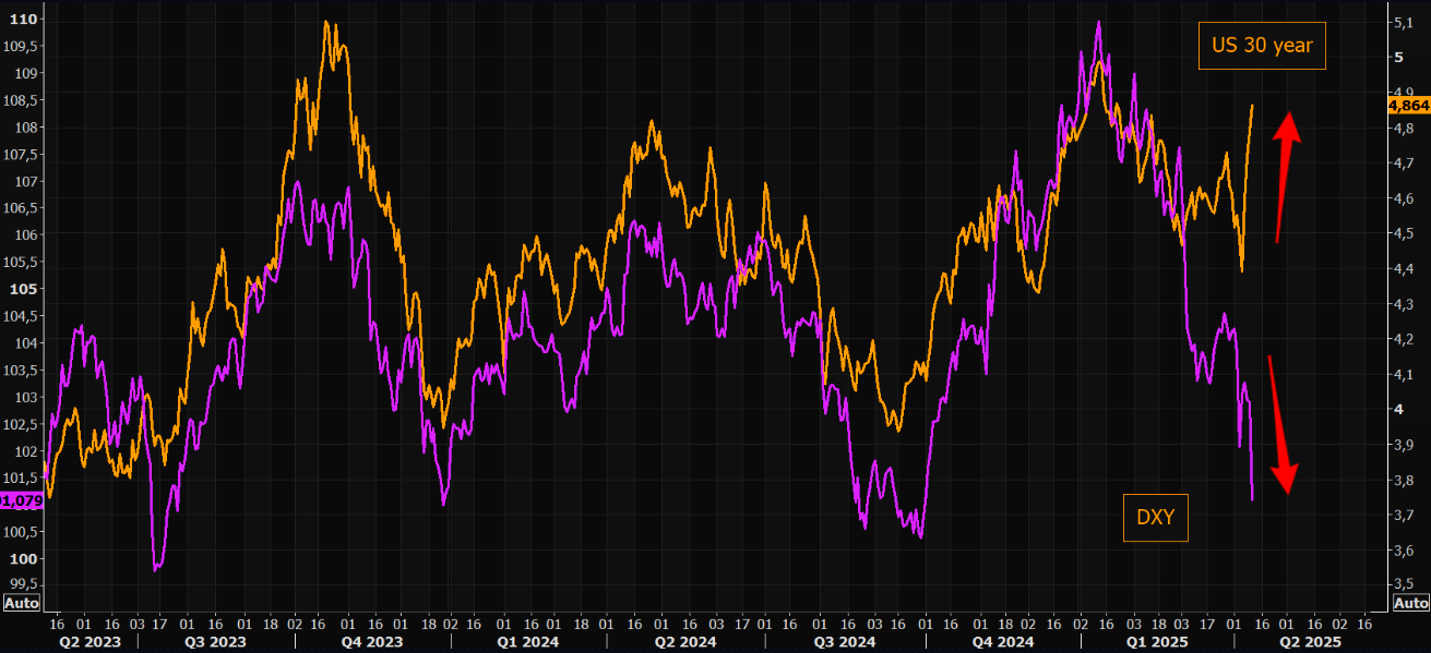 周五亚洲时段,伴随着美元指数在失守100大关后进一步下跌,疯狂的美债抛售也在全球针锋相对的关税政策残酷收尾的一周中持续发酵,这些关税政策加剧了人们对经济深度衰退的担忧,并极大程度地动摇了投资者对美国资产的信心。