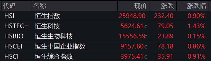 11月25日,香港恒生指数开盘涨0.9%,恒生科技指数涨1.43%。