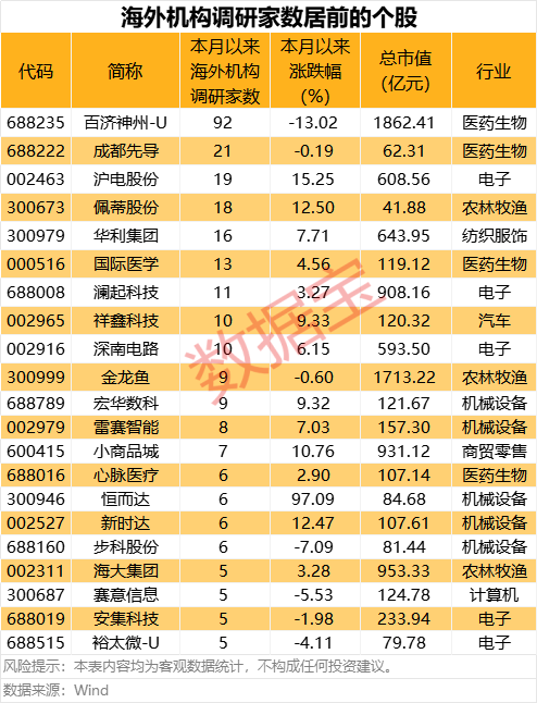 根据调研日期截止日统计,本月以来,海外机构对73股进行调研。从海外机构调研家数来看,9股获得10家及以上海外机构调研,百济神州-U居于首位,共获得92家海外机构调研;成都先导、沪电股份、佩蒂股份,分别获得21家、19家、18家海外机构调研。