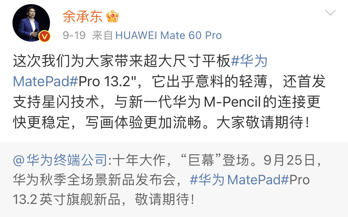 据此前华为终端官方微博发布的消息,华为将在9月25日的华为秋季全场景新品发布会上发布华为MatePad Pro 13.2英寸旗舰新品。余承东表示,该机型首发支持星闪技术。