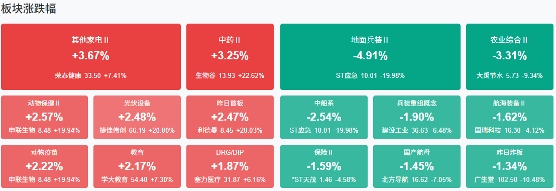市场全天震荡调整,三大指数小幅收跌。沪深两市全天成交额1.60万亿,较上个交易日缩量3377亿。盘面上市场热点快速轮动,个股涨多跌少,全市场超3300家个股上涨。从板块来看,医药板块全线逆势走强,创新药概念延续强势,昂利康涨停;中药股展开补涨,维康药业涨停;光伏概念反弹,捷佳伟创涨停;午后AI应用端活跃,智能体方向领涨,鼎捷数智涨超10%;数据要素概念走强,深桑达A涨停。下跌方面,体育概念集体调整,共创草坪跌停。