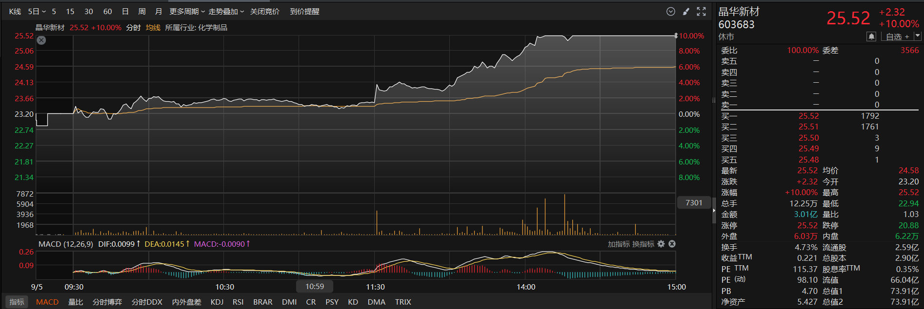晶华新材周五发布机构调研纪要表示,在动力电池上,公司的产品成熟运用于各类量产电池及储能上,紧跟固态电池的产业化进展,提前研究适配的材料性能,为未来技术成熟后的大规模应用做好技术准备。二级市场上,晶华新材周五收盘涨停。