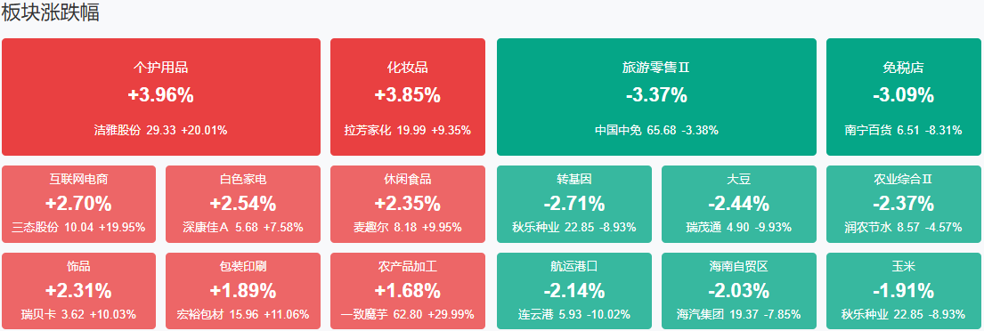 板块方面,美容护理、电商、食品、银行等板块涨幅居前,免税、港口、海南、轨交等板块跌幅居前。