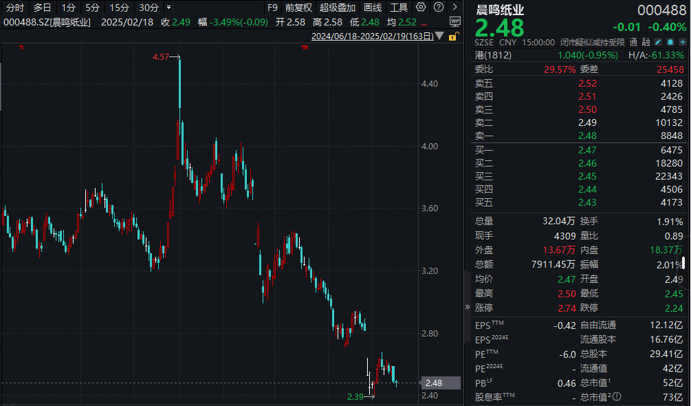 回溯前情,晨鸣纸业于2024年11月19日晚间披露公告称,近年来,造纸行业新增产能集中投放,短期供需矛盾突出,公司主要纸品价格特别是白卡纸价格受供需矛盾影响大幅下滑,公司盈利水平持续走低,利润转亏;叠加部分金融机构压缩贷款规模,导致公司现阶段暂时面临流动资金紧张,公司及个别子公司阶段性出现个别债务未能如期偿还的情形,部分债权人就该等债务向法院提起诉讼并申请财产保全,法院裁定冻结了公司及子公司部分银行账户。
